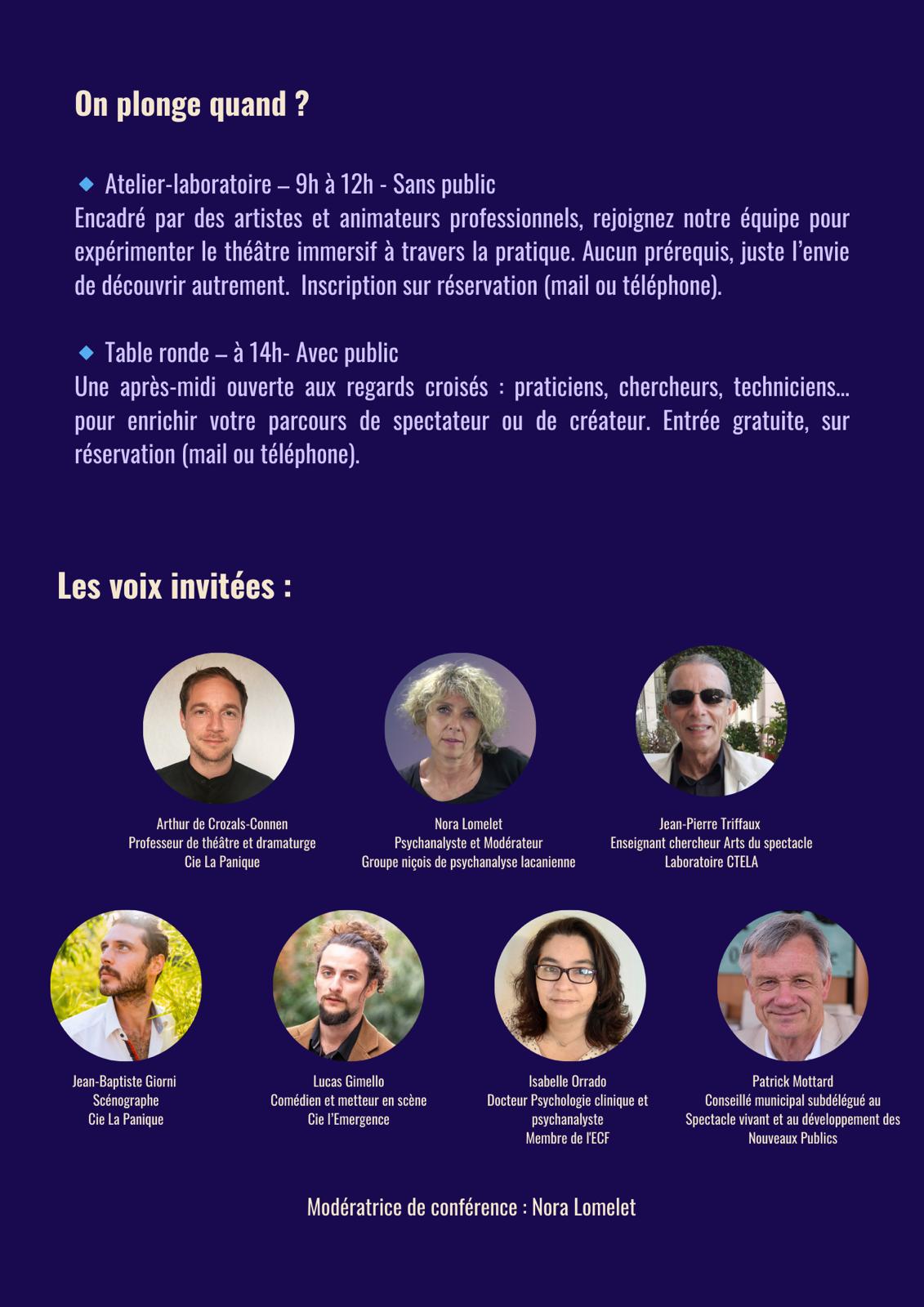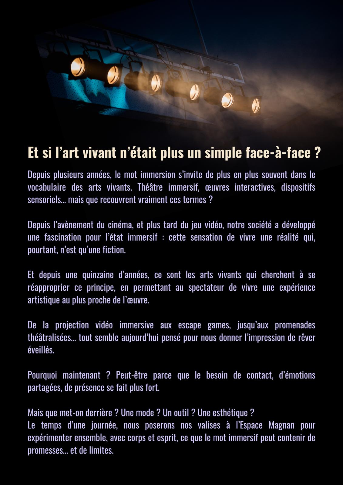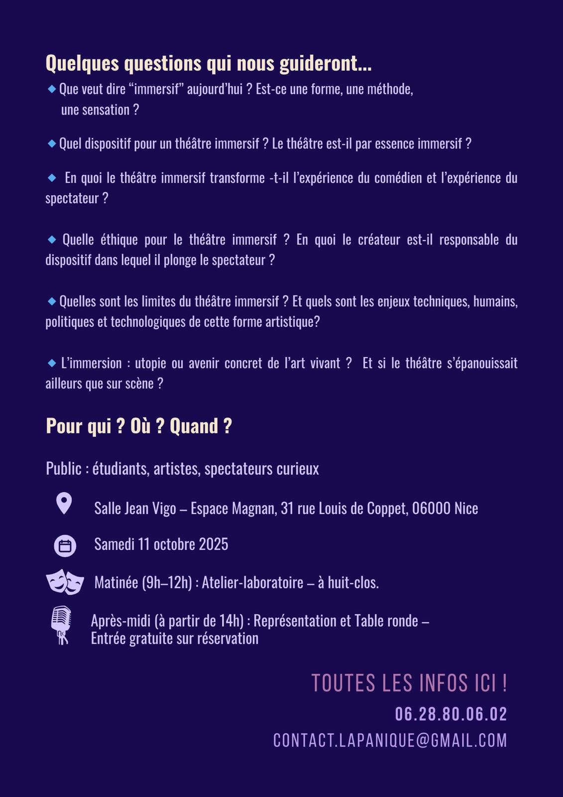 AGENDA CULTUREL 2025-2026 | Spectacles & Cinéma> LIEN BILLETTERIE EN LIGNE : HELLO ASSO et PASS CULTURE > TARIFS sauf évènements spéciaux : 16 € plein, 14 € intermédiaire (demandeurs d'emploi, RSA, + 65 ans, groupe 10 pers et +), 12 € réduit (adhérents Espace Magnan, étudiants, - 16 ans, PASS Culture) - sur justificatif | en temps scolaire : 6 ou 7 € par élève (infos enseignants) Carte adhérent Culture : 15 € OCTOBRE 2025 Théâtre de l'absurde Résidence de création Tout Public dès 14 ans LE CABARET DES OISEAUX Cie Le Vaisseau SAMEDI 4 OCTOBRE 2025 | 19h30 Dans le cadre du Festival Scènes d'Automne (Ville de Nice) Dans une vaste pièce sombre, traversée d’étranges lueurs, une lourde porte se dresse, surveillée par des bureaucrates. Un homme se présente, qui veut franchir cette porte. L’accès lui est catégoriquement refusé, mais l’individu ne se laisse pas abattre, et s’engage corps et âme dans une lutte effrénée pour convaincre cette administration de le laisser passer : il est à la recherche d’un être cher, passé de l’autre côté, et prêt à tout pour le retrouver. De négociation en supplication, il se voit peu à peu orienté vers une procédure déconcertante, dont la complexité désarmante semble se renforcer à chaque avancée. L’acharnement de l’homme à se soumettre à cette démarche délirante, dont l’issue, constamment ajournée, semble hautement incertaine, s’avère cruel et comique. Malgré les mises en garde, la fatigue et le découragement, il choisit de s’enfoncer toujours plus dans ce labyrinthe bureaucratique, au risque de se perdre, mû par l’espoir tenace de revoir la personne aimée. Durée 1h15 | Tarifs SPECTACLE : 16, 14, 12 € RENCONTRE GRATUITE avec les artistes le JEUDI 2 OCT à 18h30 Distribution Mise en scène et scénographie : Clara Chrétien . Dramaturgie et texte : Nina Ayachi & Clara Chrétien . Direction d’acteurs : Nina Ayachi . Avec : Juliette de Ribaucourt, Zoé Guillemaud et Stéphane Monpetit . Création costumes : Dachi Siboshvili . Création et régie son : Guillaume Ohrel . Création et régie lumière : Alexi Moradian & Guillaume Ohrel . Collaboration artistique : Icare Bamba & Lucien Roux . Construction décor : Alice Guiet . Carte de la Cité : Ida Fermaud Soutiens et coproductions Aide à l’écriture : association Beaumarchais-SACD. Soutien : Fonds Régnier pour la Création, Ville de Marseille, Région Sud et La Distillerie – Lieu de Création Théâtrale, dans le cadre du dispositif Place aux Compagnies. Résidences : Théâtre des Carmes André Benedetto, dans le cadre des Résidences Tremplin – DRAC PACA, la Fabrique Mimont – Cannes. Danse | Théâtre | Arts visuels Artistes Associés Tout public SOMA, corps vivants Cie Le Sixièmétage VENDREDI 10 OCTOBRE 2025 | 19h30 À la façon des surréalistes, les créations de la Cie Le Sixièmétage sont construites comme un puzzle où différents médiums se confondent et s’embrassent pour donner vie à une forme de poésie chorégraphique inédite et surprenante. SOMA, en grec veut dire "corps", matière vivante (champignons, végétaux, animaux, humains, corps célestes…). SOMA nous projette dans un univers spectaculaire où se jouent une touche de cabaret cynique et drôlatique, des faux airs de conférence scientifique, une suite d’apparitions extraordinaires qui célèbrent les liens invisibles qui relient les espaces et les espèces. Une pièce comme une ressource pour penser demain différemment, offrant au public une expérience inédite où la poésie et la survie du merveilleux sont les piliers de notre salut. Durée 1h15 | Tarifs SPECTACLE : 16, 14, 12 € RENCONTRE GRATUITE avec les artistes le JEUDI 9 OCT à 18h30 Distribution Chorégraphie et musique : Jeff Bizieau Mise en scène et texte : Pascal Renault Interprètes : Jessie Veerathera-Pillay, Morena Di Vico, Jeff Bizieau, Pascal Renault Partenaires Région Sud, Département Alpes-Maritimes, Ville de Nice, DRAC PACA (dispositif Rouvrir le monde), Culture Moves Europe & Goethe Institut. Partenaires SOMA Fresh Winds International Art Biennale - Iceland, Our Air International Artists in Residence - Finland, Théâtre National de Nice, Studio Antipodes (Le 109 Pôle des cultures contemporaines), Espace Magnan. Infos : 06.28.80.06.02 / contact.lapanique@gmail.com Théâtre | Atelier | Table Ronde Tout public IMMERSION(S) Pratiques immersives et enjeux du théâtre contemporain Cie La Pánique SAMEDI 11 OCTOBRE 2025 Journée de pratique et de réflexion sur le thème du théâtre immersif, réunissant chercheurs du CTELA (Université Côte d’Azur), membres du Groupe Niçois de Psychanalyse Lacanienne, artistes et professionnels du spectacle vivant de compagnies locales. Et si l’art vivant n’était plus un simple face-à-face ? L’immersion envahit aujourd’hui les arts vivants : théâtre participatif, dispositifs sensoriels, promenades théâtralisées… Mais s’agit-il d’une mode, d’un outil ou d’une véritable esthétique ? Le temps d’une journée à l’Espace Magnan, artistes, chercheurs et spectateurs exploreront ensemble les promesses - et les limites - de cette expérience qui bouscule notre rapport à la scène. Atelier-Laboratoire - 9H à 12H - Sans public Initiez-vous au théâtre immersif avec des artistes et animateurs professionnels. Ouvert à tous, gratuit sur réservation. Table Ronde à 14H - Avec public Un après-midi d’échanges entre praticiens, chercheurs et techniciens, pour nourrir la curiosité des spectateurs comme des créateurs. Entrée gratuite sur réservation. Danse | Musique | Marionnettes | Cinéma | Ateliers... Tout public 3e FESTIVAL HAPPY INDE Cie Lez'arts Indiens VENDREDI 10 > DIMANCHE 19 OCTOBRE 2025 Avec le soutien de la Ville de Nice, l'Ambassade de l'Inde de Paris et l'Indian Council of Cultural Relations (ICCR) à Delhi. En collaboration avec l'Espace Magnan depuis 3 ans, le Festival met à l'ho